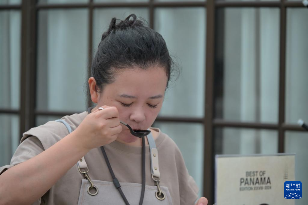 6月8日,在巴拿马西部城市博克特,来自中国深圳的国际评委郭锦在第28届“巴拿马最佳”咖啡生豆大赛上进行咖啡杯测。