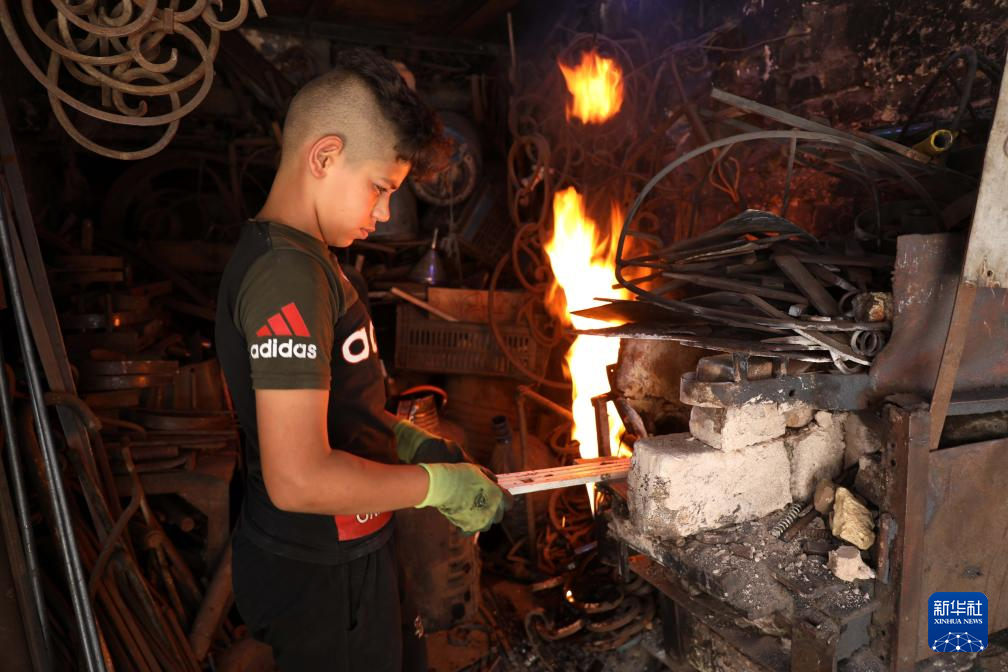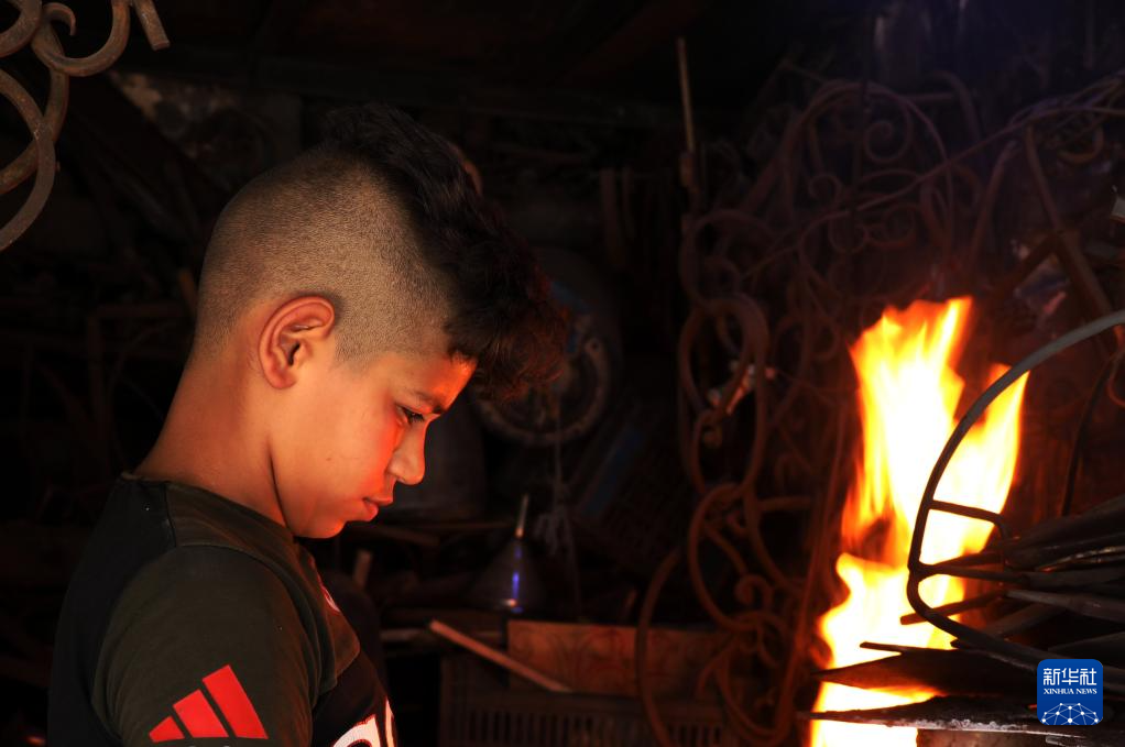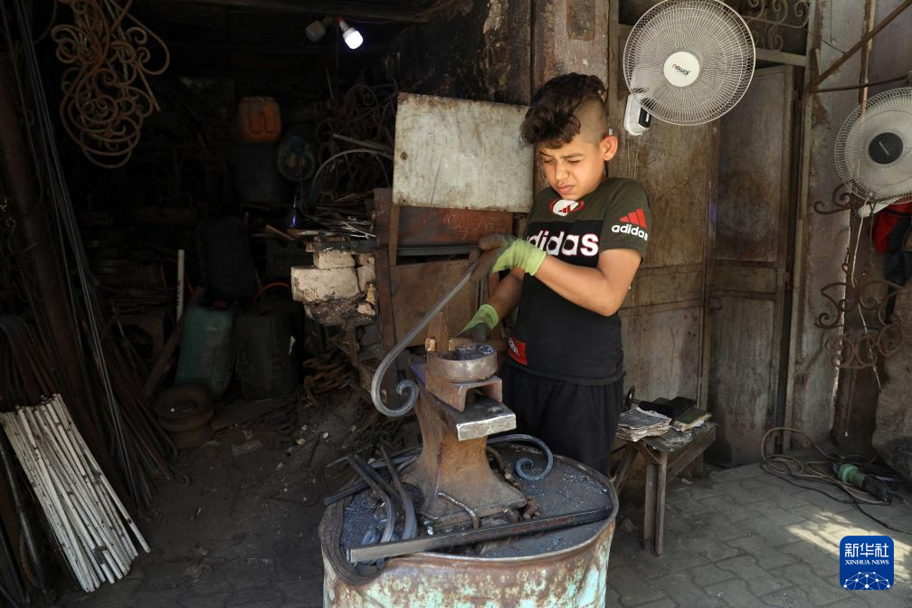 6月8日,在伊拉克巴格达,萨贾德在一家铁匠铺里工作。