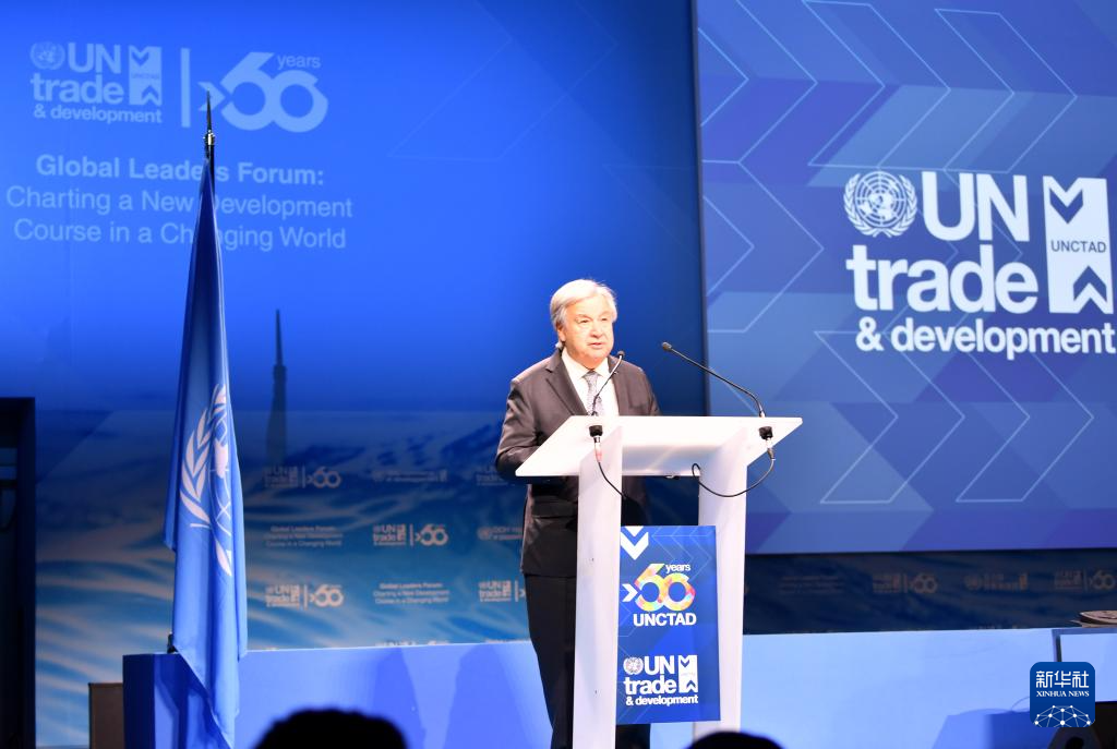 6月12日,在瑞士日内瓦万国宫,联合国秘书长古特雷斯在联合国贸易和发展会议全球领导人论坛上致辞。
