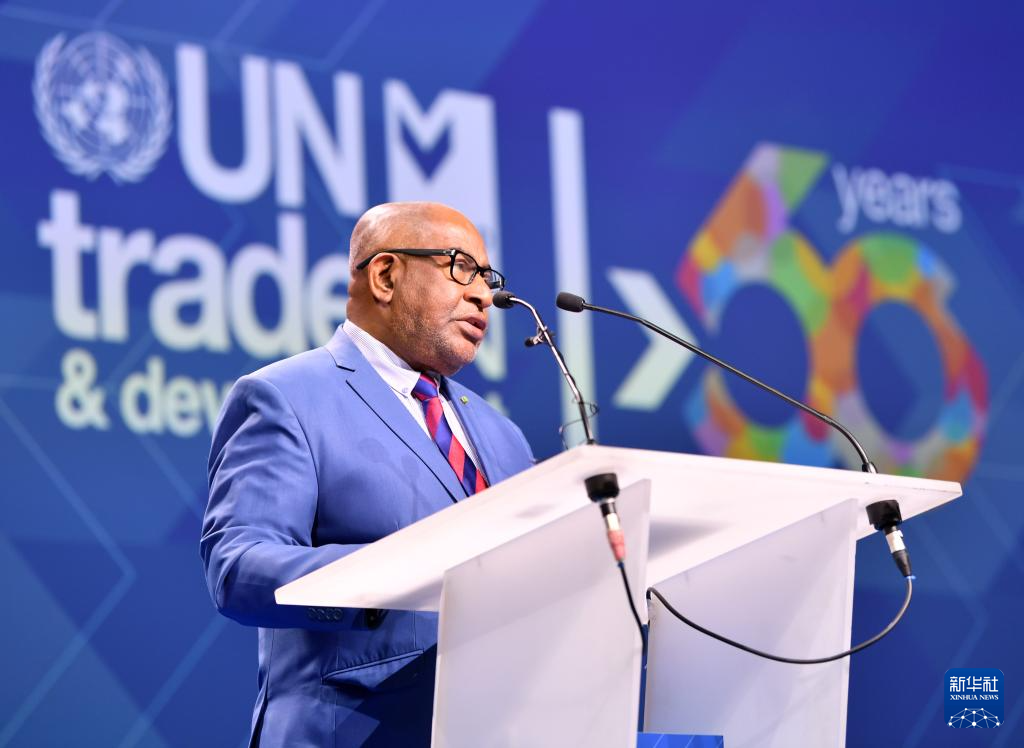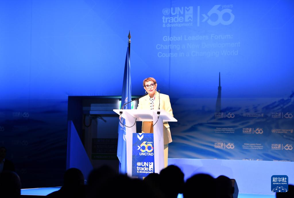 6月12日,在瑞士日内瓦万国宫,联合国贸易和发展会议秘书长格林斯潘在联合国贸易和发展会议全球领导人论坛上致辞。