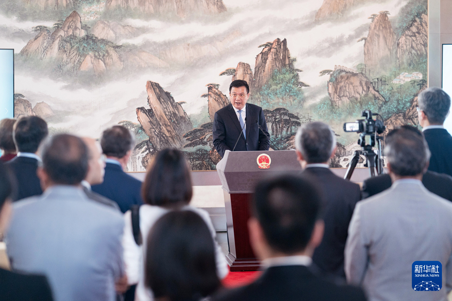6月14日,新华通讯社与美国媒体和战略学术界交流对话会在华盛顿中国驻美大使馆举行。这是新华社社长傅华发表主旨演讲。