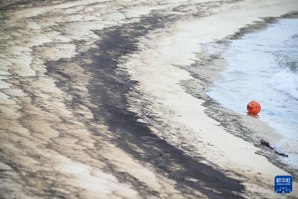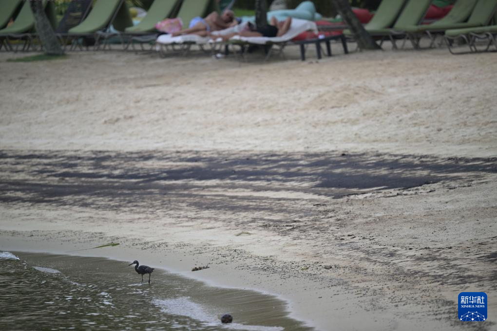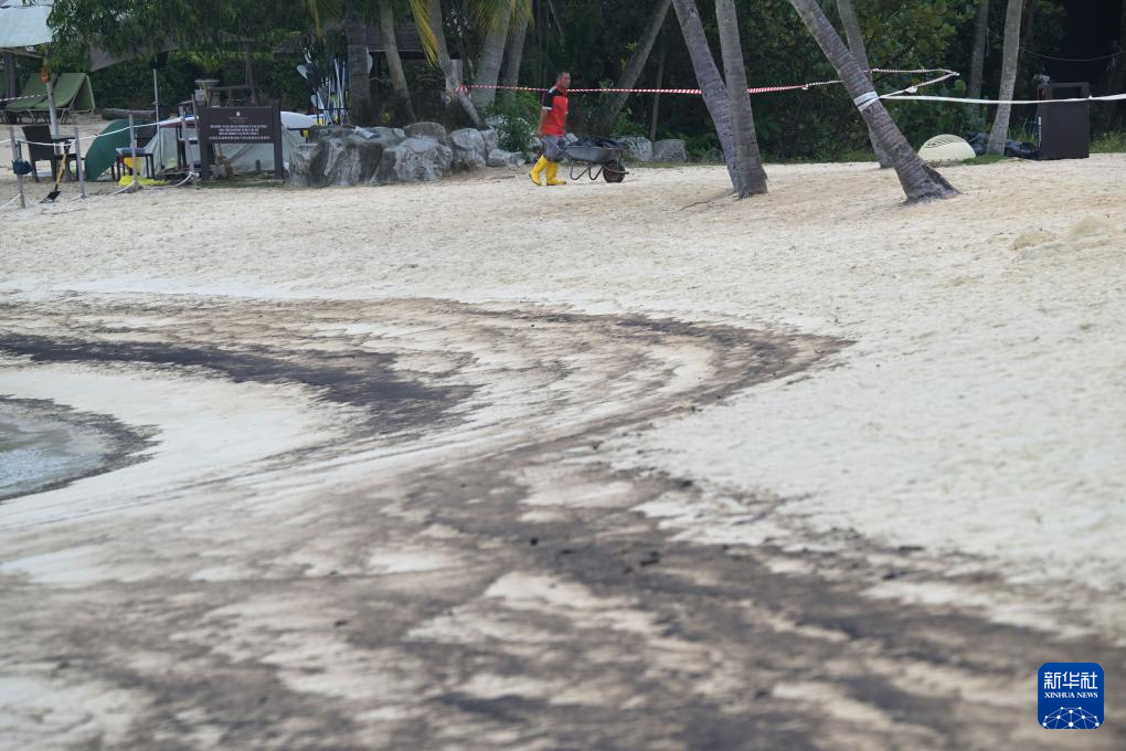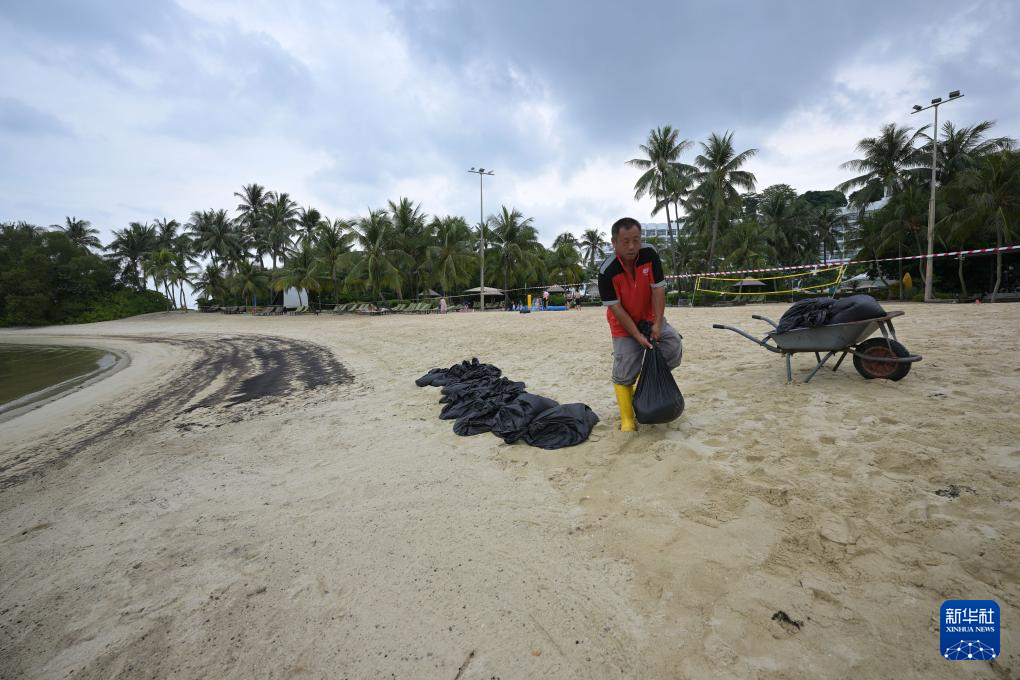 6月15日,一名员工在新加坡圣淘沙岛清理被污染的海滩。