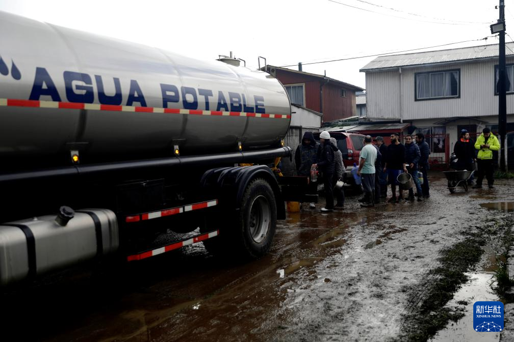 6月13日,在智利比奥比奥大区库拉尼拉韦,当地居民排队领水。