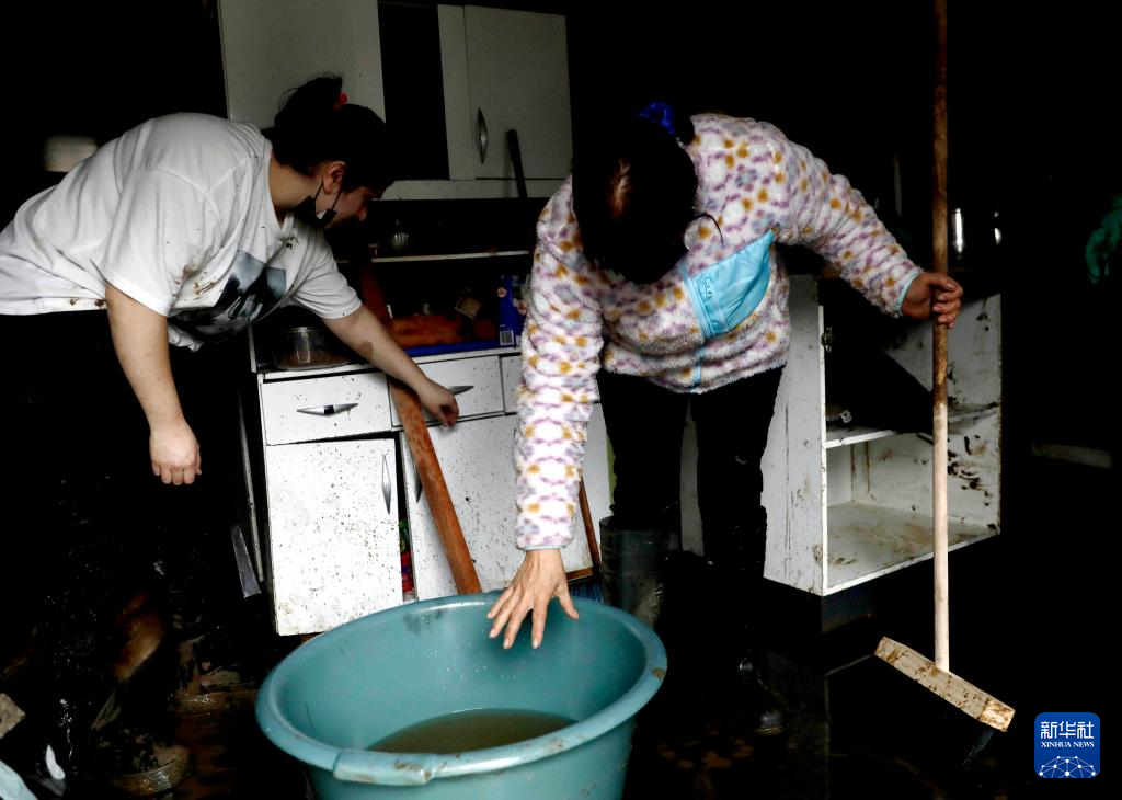 6月13日,在智利比奥比奥大区库拉尼拉韦,当地居民清理家中积水。