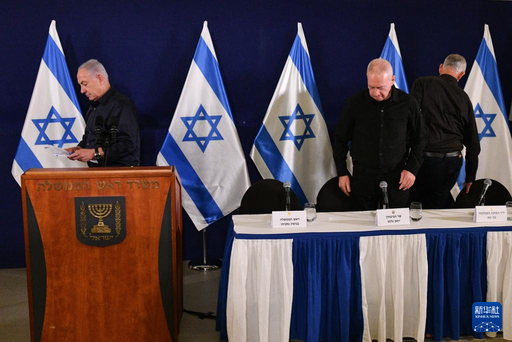 这张2023年11月18日的资料照片显示的是,以色列战时内阁出席一场在特拉维夫举行的新闻发布会。他们是以色列总理内塔尼亚胡、以色列国防部长加兰特和以色列前国防部长、反对党国家团结党领导人甘茨(从左至右)。