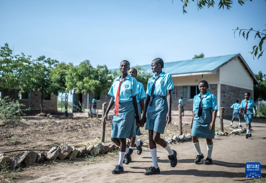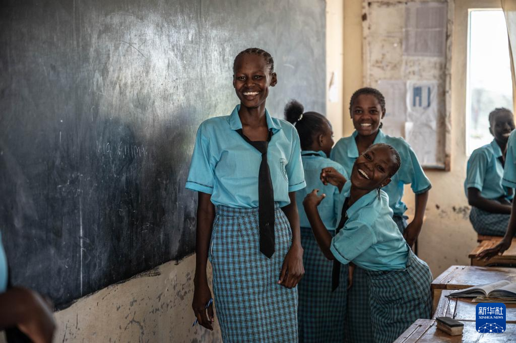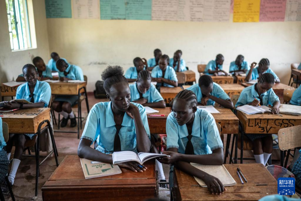 6月18日,在肯尼亚图尔卡纳郡卡库马难民营内,毕生希望女子中学的学生在课间休息。