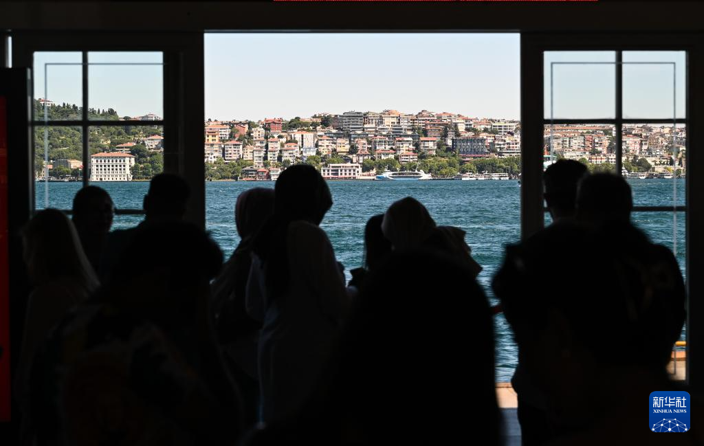 6月19日,游客在土耳其伊斯坦布尔博斯普鲁斯海峡一处轮渡处等待乘船。