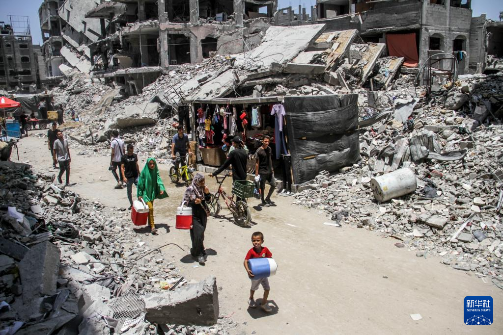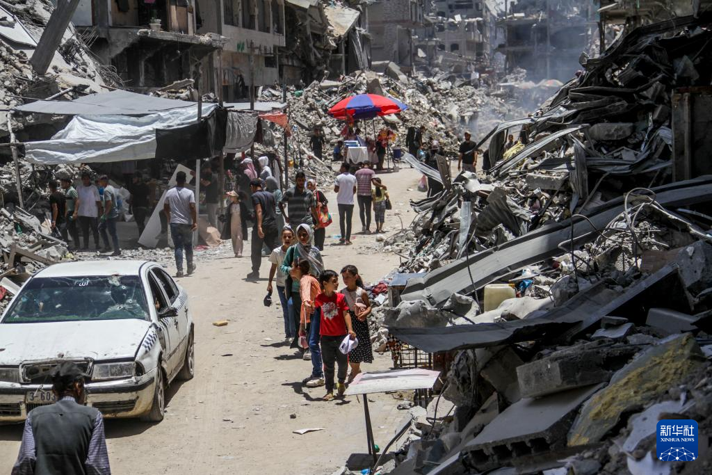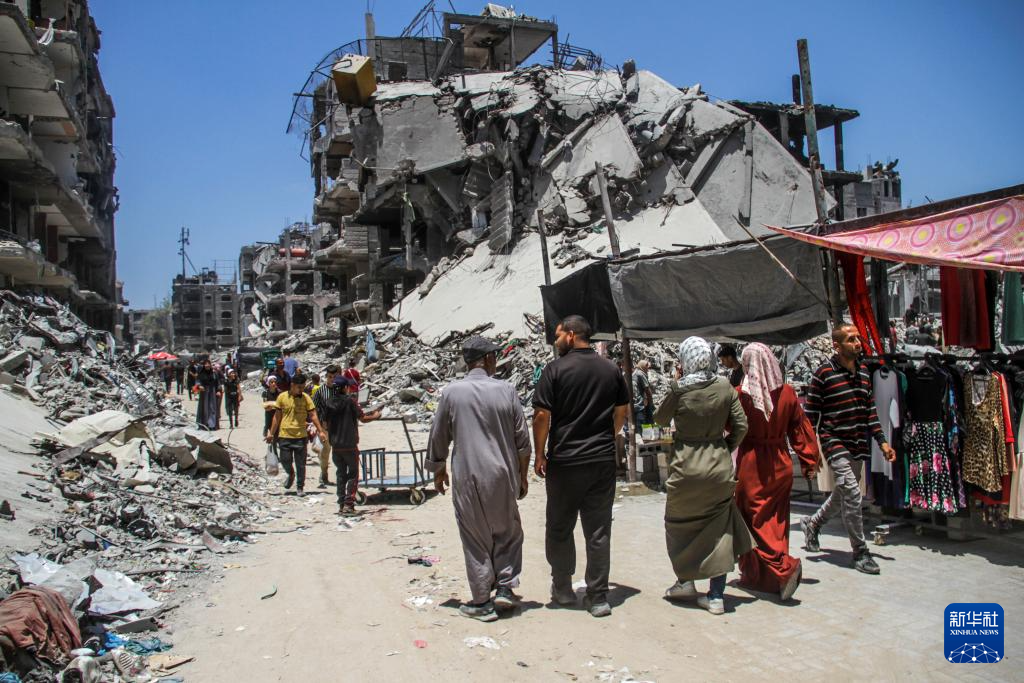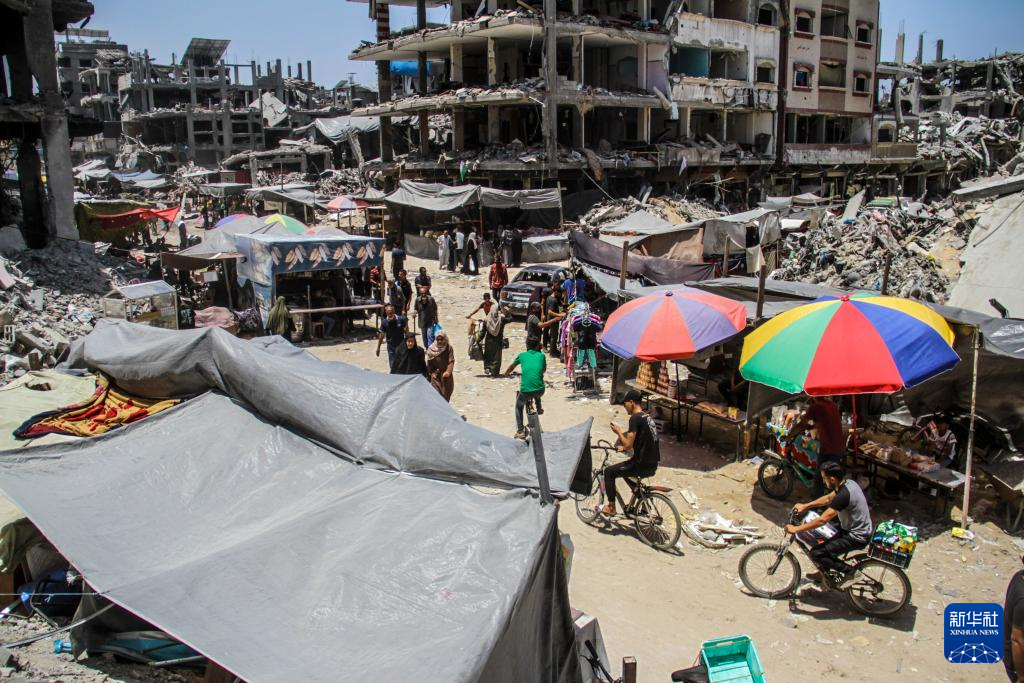 6月20日,在加沙地带北部杰巴利耶难民营,人们在建筑废墟间搭建了一处集市。