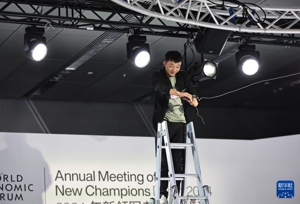6月24日,工作人员在夏季达沃斯论坛主会场大连国际会议中心调试灯光。