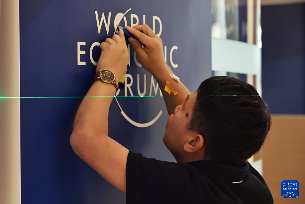 6月24日,工作人员在夏季达沃斯论坛主会场大连国际会议中心粘贴英文标识。