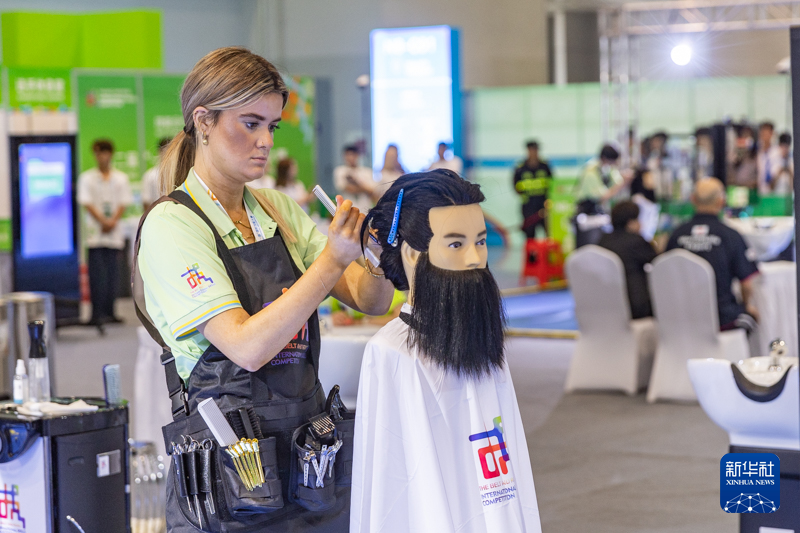 6月24日,在重庆国际博览中心举行的第二届“一带一路”国际技能大赛现场,参赛选手在参加美发项目比赛。新华社记者 黄伟 摄pagebreak