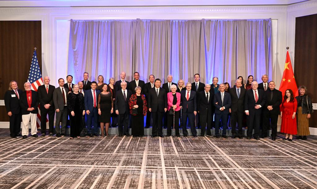 当地时间2023年11月15日晚,国家主席习近平在美国旧金山出席美国友好团体联合举行的欢迎宴会。宴会开始前,习近平会见飞虎队和史迪威将军后人、鼓岭、艾奥瓦州、华盛顿州等方面友好人士代表,同他们亲切交谈并合影留念。新华社记者 谢环驰 摄