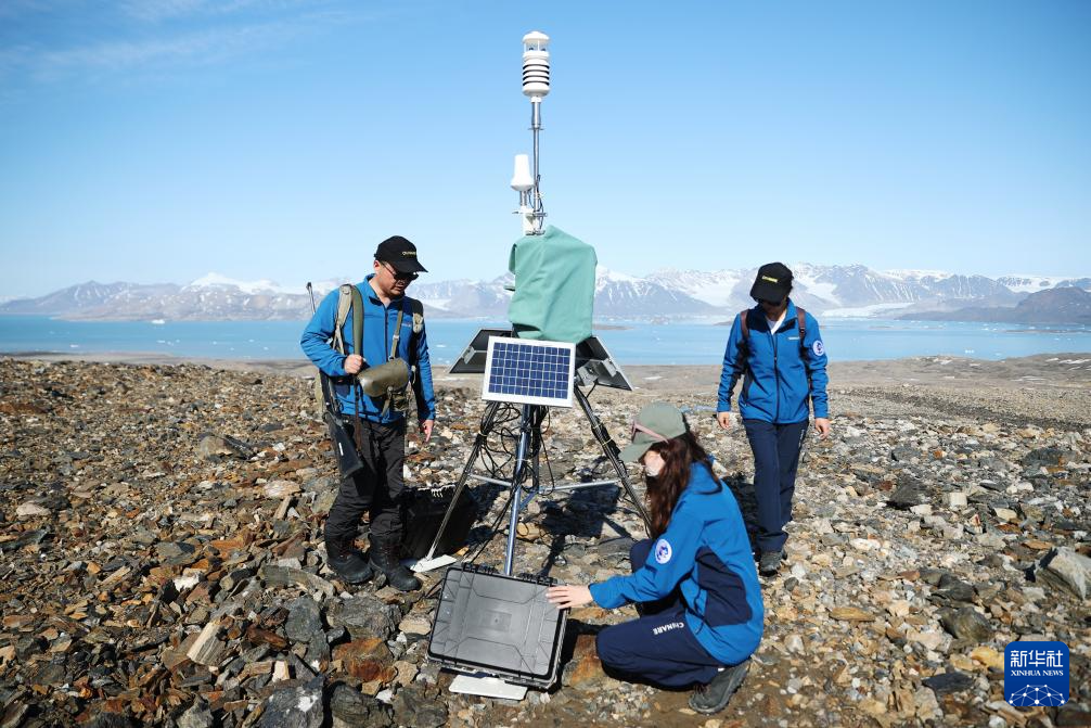 6月22日,在挪威新奥勒松,科考队员胡正毅(左)、赵红颖(右)、武小涵在外出采样途中检查设备。