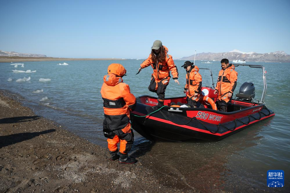 6月22日,在挪威新奥勒松,黄河站科考队员乘坐小艇外出进行采样工作。