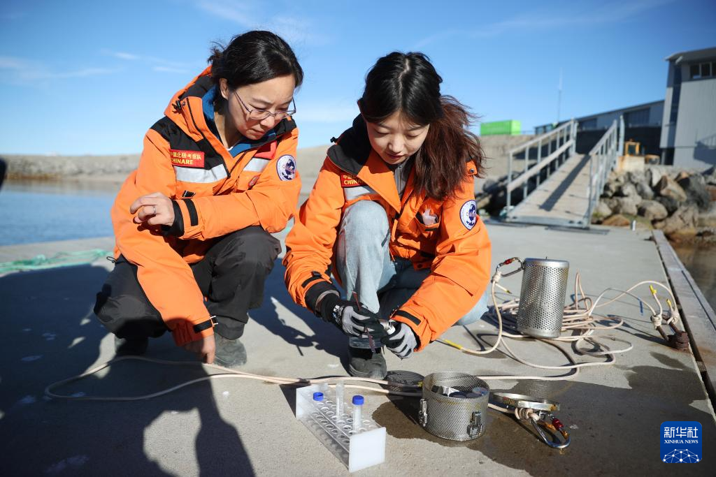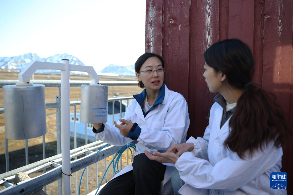 6月21日,在挪威新奥勒松,科考队员、同济大学化学科学与工程学院教授赵红颖(左)和博士生武小涵在黄河站检查采样设备时交流。