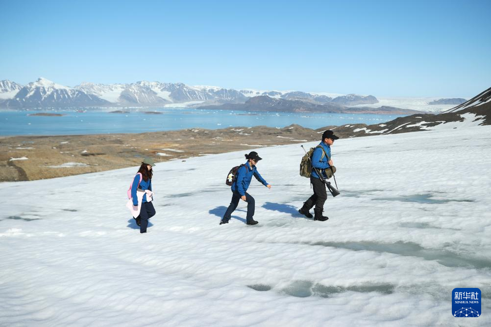6月22日,在挪威新奥勒松,科考队员胡正毅(右)、赵红颖(中)、武小涵外出进行采样工作。