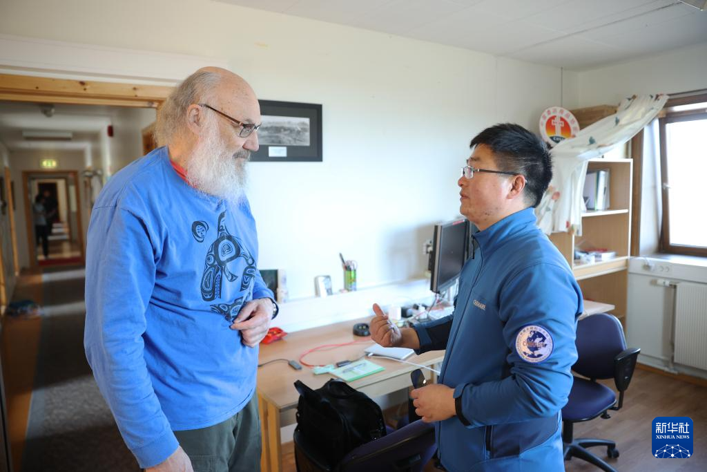 6月21日,在挪威新奥勒松,科考队员胡正毅(右)在黄河站内同挪威极地研究所教授金·霍尔曼交流。