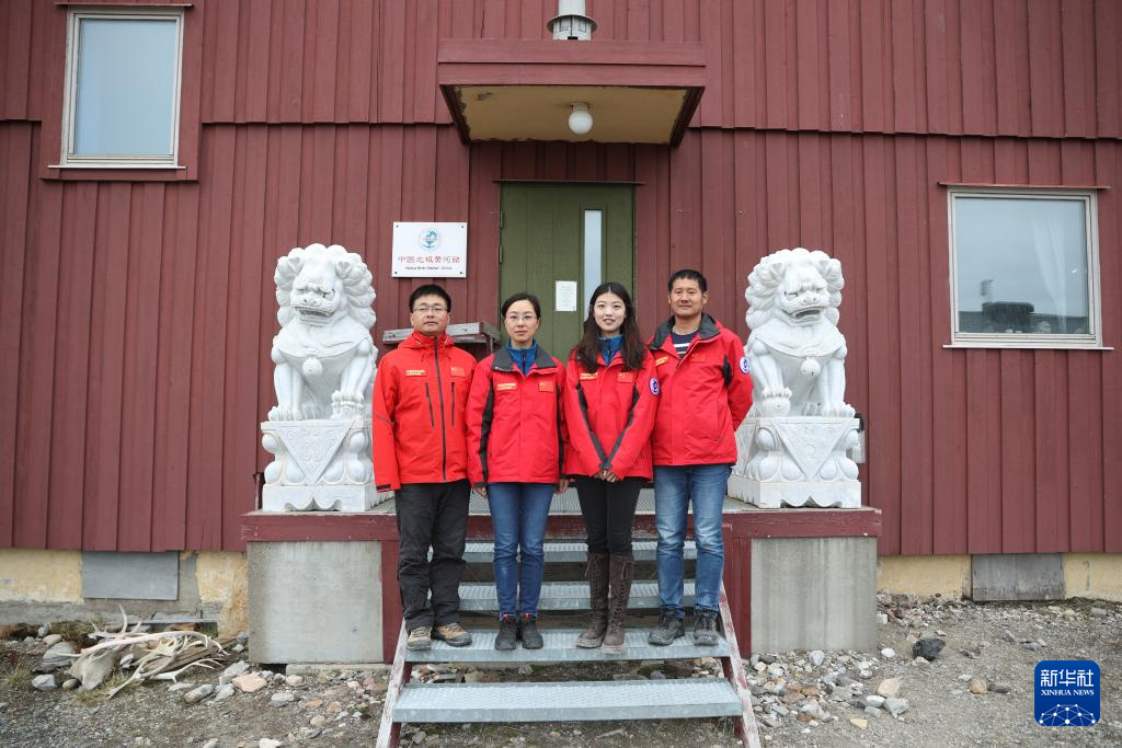6月23日,在挪威新奥勒松,科考队员胡正毅、赵红颖、武小涵、许浩(从左至右)在中国北极黄河站前合影。