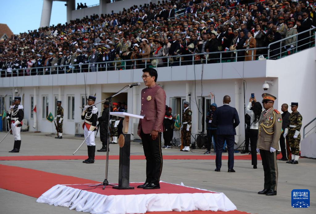 6月26日,在马达加斯加首都塔那那利佛,马达加斯加总统拉乔利纳(中)在国庆日阅兵活动现场发表讲话。