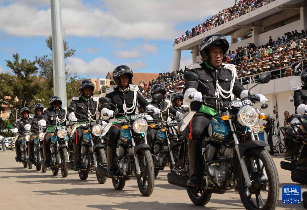 6月26日,在马达加斯加首都塔那那利佛,马达加斯加警察摩托车方阵接受检阅。