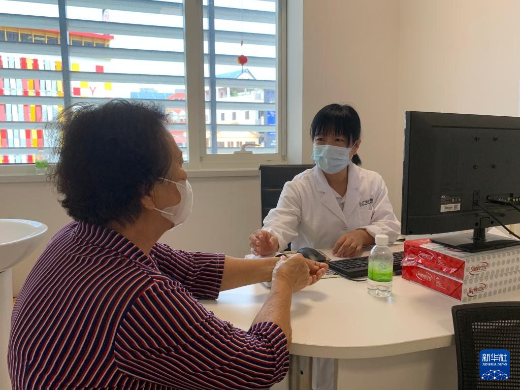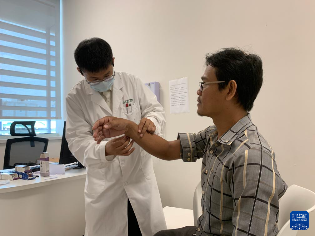6月26日,援柬中国中医医疗队队员在柬埔寨金边为患者看病。