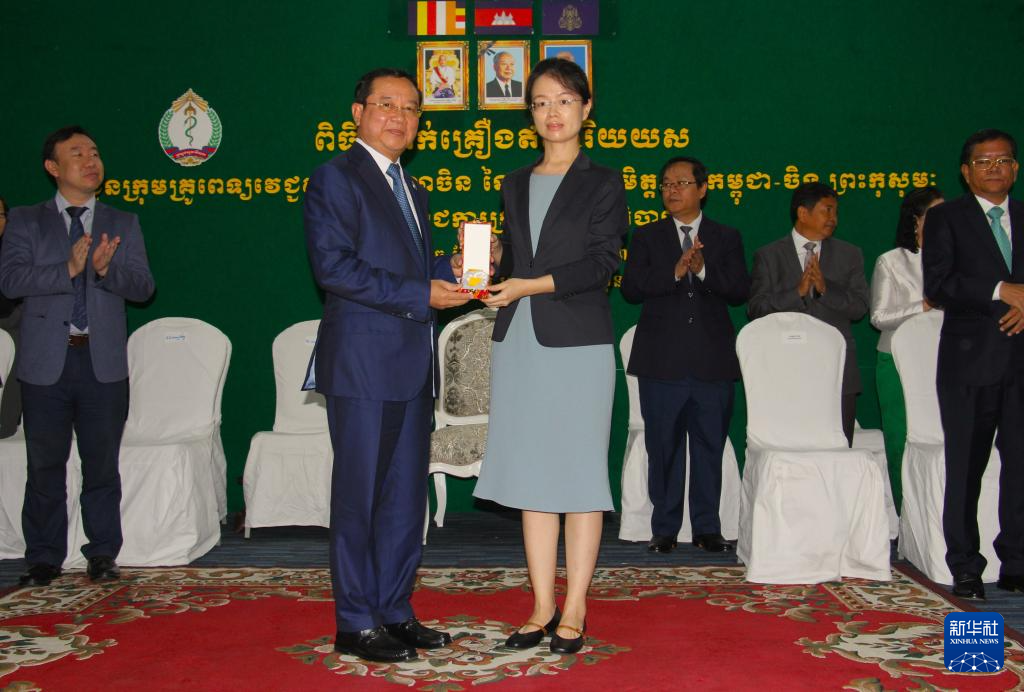 6月27日,柬埔寨卫生大臣秦拉(左)在金边向援柬中国中医医疗队队员授勋。