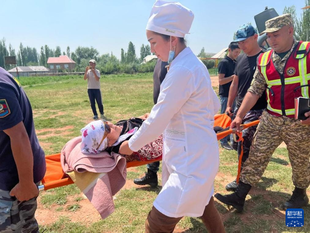 6月28日,在吉尔吉斯斯坦奥什州努卡特地区,救援人员转移受灾群众。