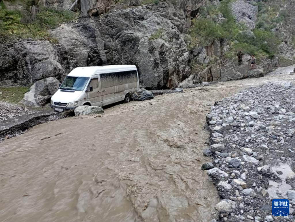 6月28日,在吉尔吉斯斯坦奥什州努卡特地区,一辆中巴车停在被泥石流冲毁的道路旁。