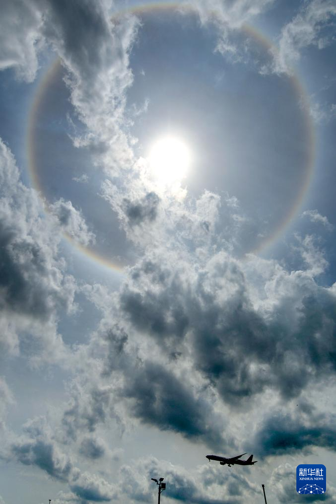 泰国曼谷:日晕 -7月1日,在泰国曼谷素万那普机场,一架飞机从日晕下方飞过。'...