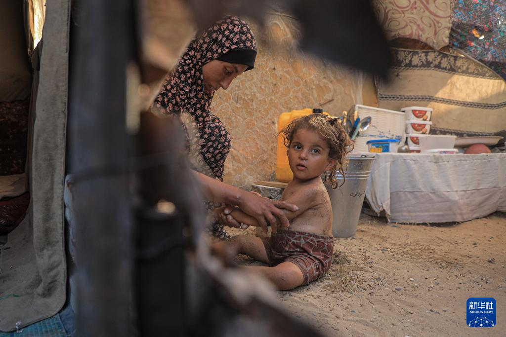 7月11日,在加沙地带南部城市汗尤尼斯,一名母亲用沙土为女儿擦身。