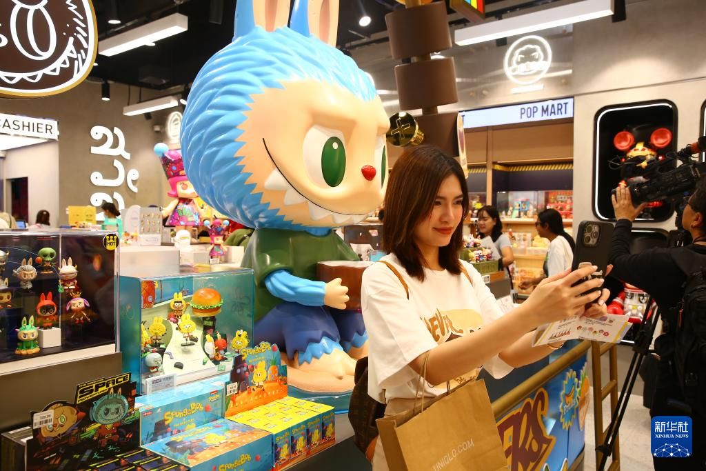 7月5日,在泰国曼谷的泡泡玛特新店内,一名女子在拉布布玩偶前自拍。