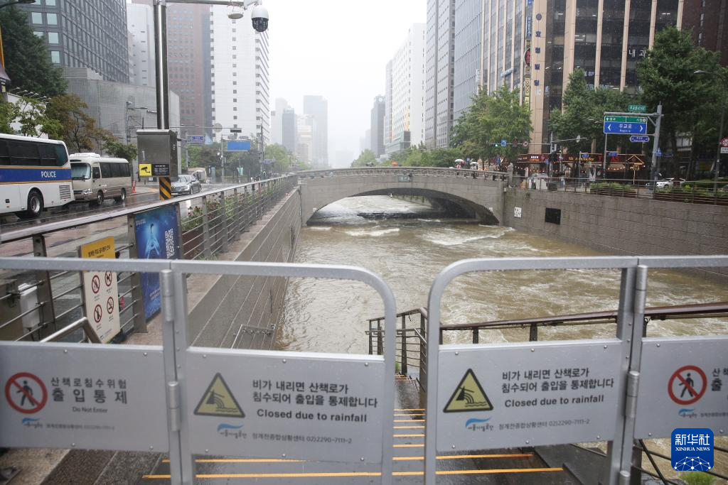 7月18日,韩国首尔的清溪川由于涨水实行封闭管理。