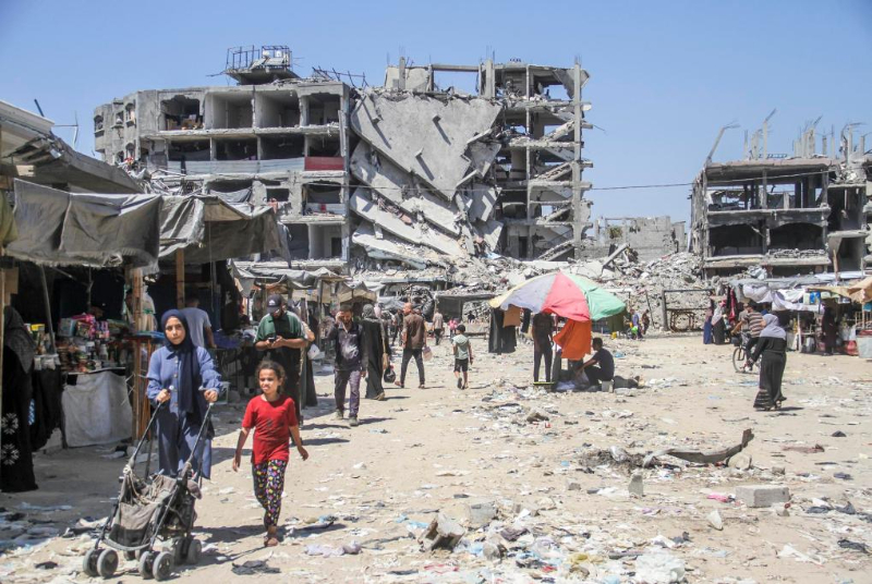 7月21日,在加沙地带北部杰巴利耶难民营,当地民众行走在废墟间。新华社发(马哈茂德·扎基摄)