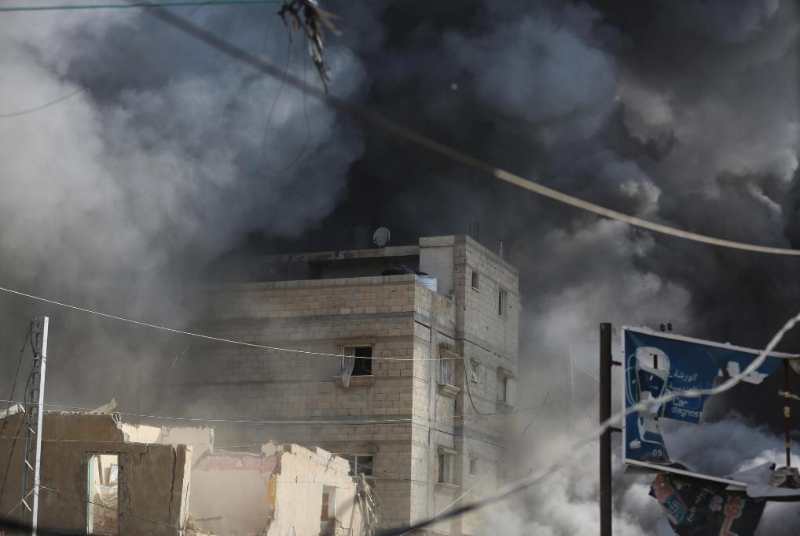 7月21日,在加沙地带中部的努赛赖特难民营,遭以军空袭的建筑冒出滚滚浓烟。新华社发(马尔万·达乌德摄)