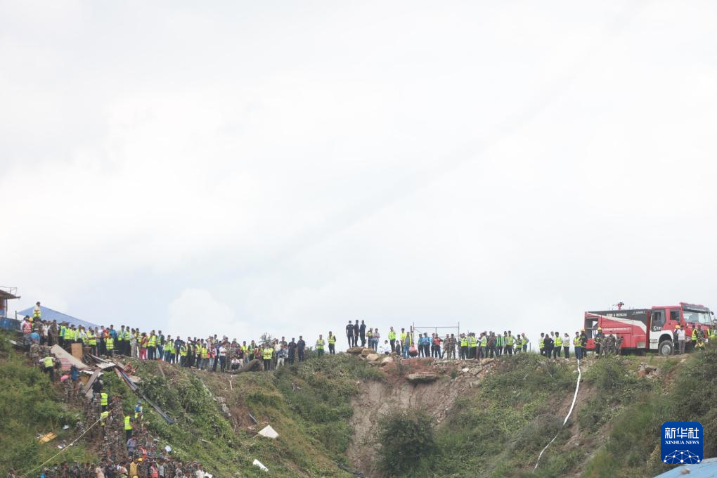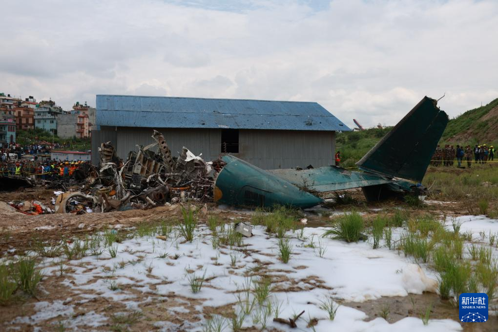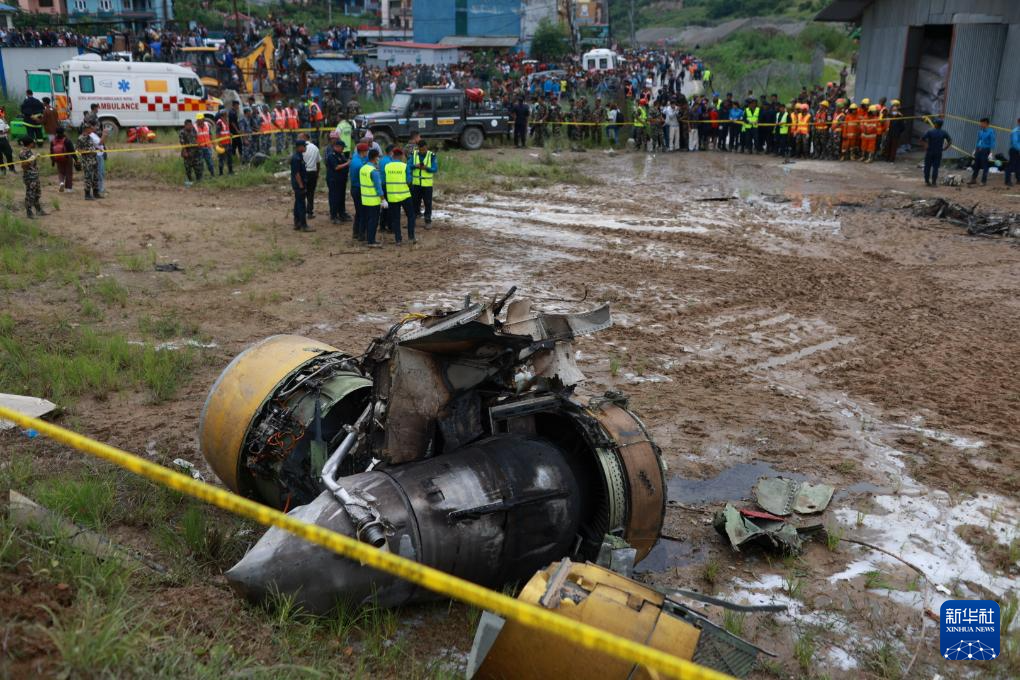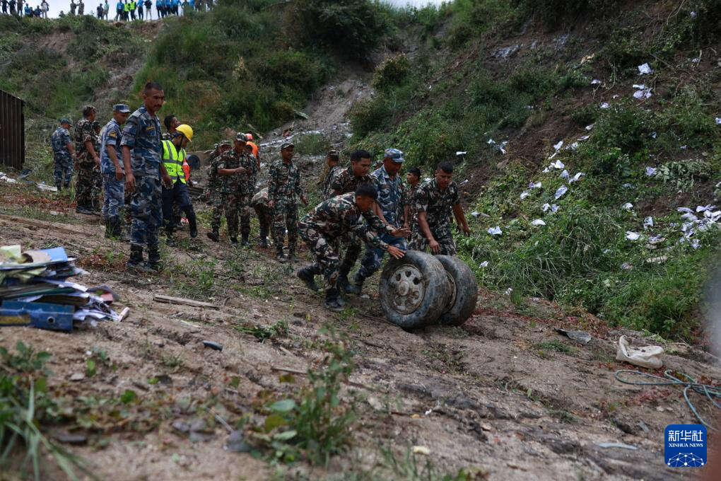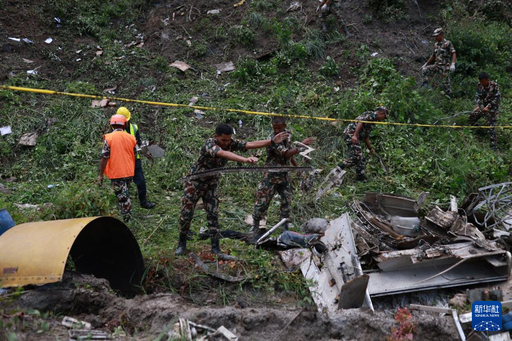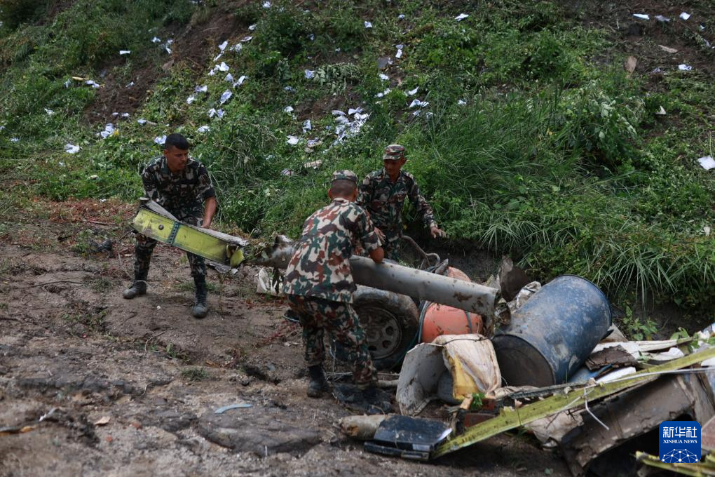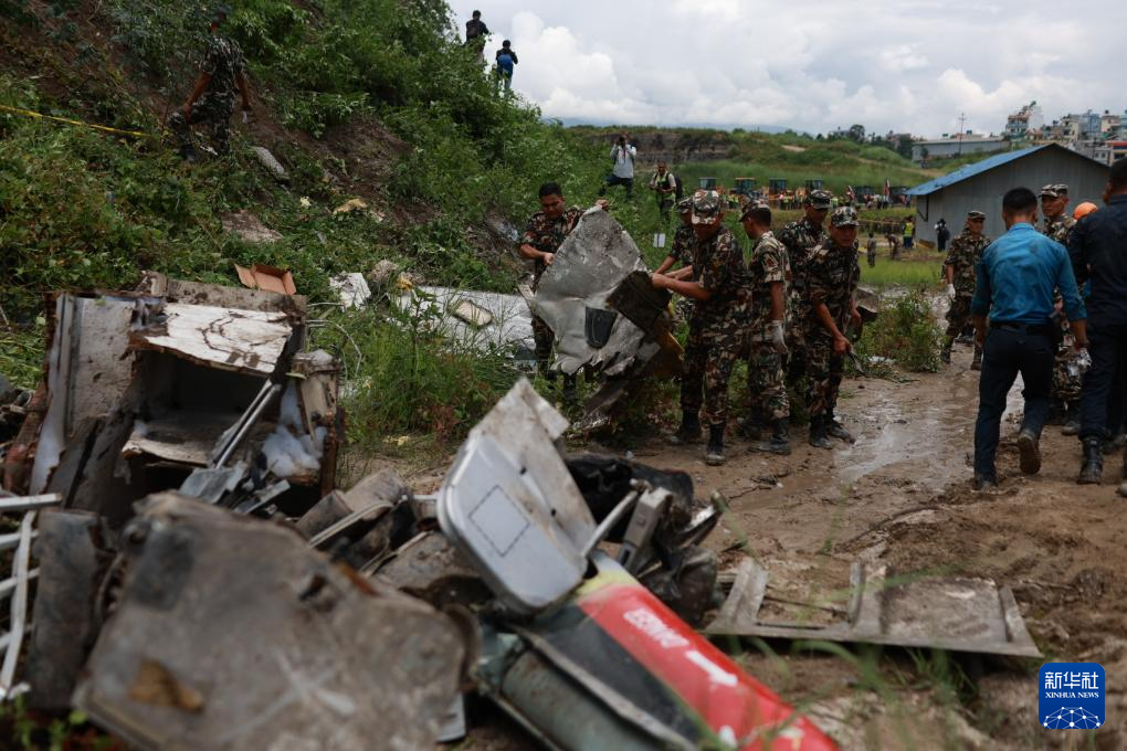 7月24日,在尼泊尔加德满都飞机坠毁现场,救援人员清理飞机残骸。