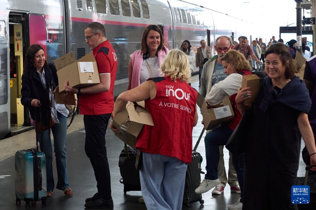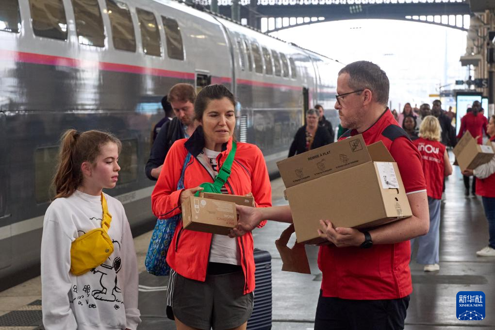7月26日,工作人员在法国巴黎北站为延误旅客发放食物。