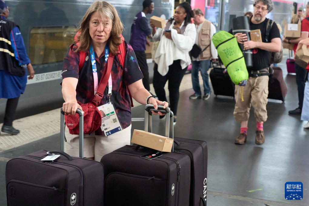 7月26日,一名加拿大奥运代表团成员乘坐延误的列车抵达法国巴黎北站。