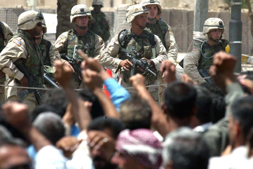 2003年6月18日,美军士兵在伊拉克首都巴格达美英联军临时总部门前持枪面对数百名示威的伊拉克人。新华社记者赵建伟摄
