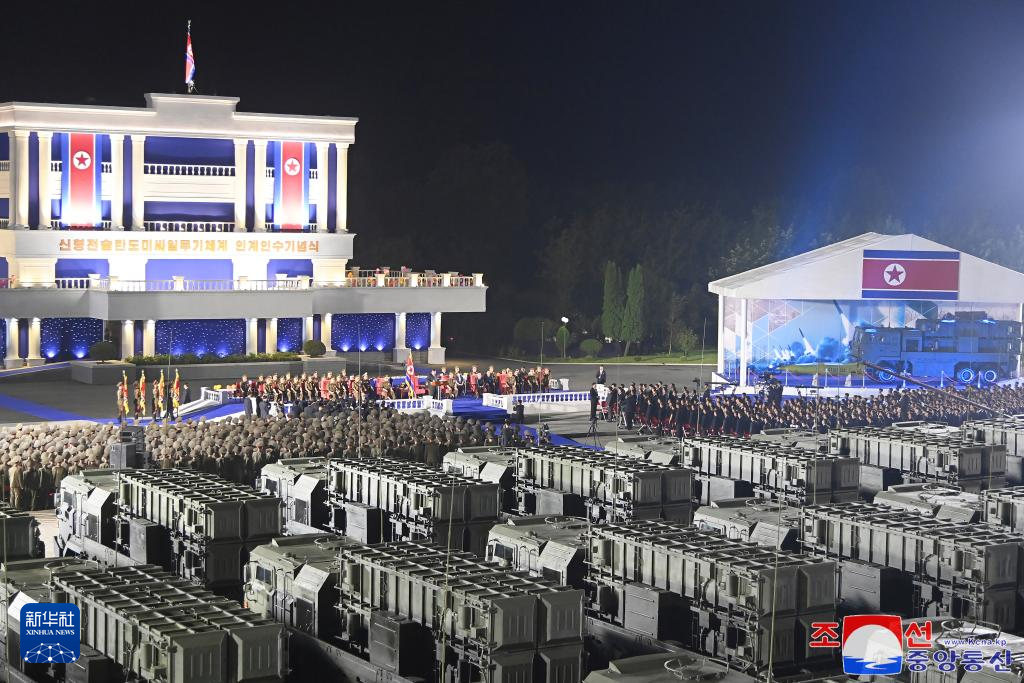 这张朝中社提供的照片显示的是在平壤举行的新型战术弹道导弹武器系统交接仪式现场。