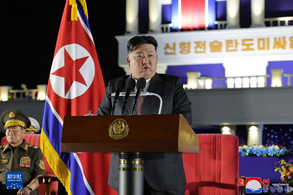 这张朝中社提供的照片显示,朝鲜劳动党总书记、国务委员长金正恩在平壤举行的新型战术弹道导弹武器系统交接仪式上发表讲话。