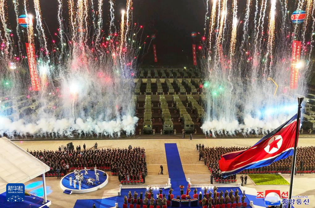 这张朝中社提供的照片显示的是在平壤举行的新型战术弹道导弹武器系统交接仪式庆祝画面。