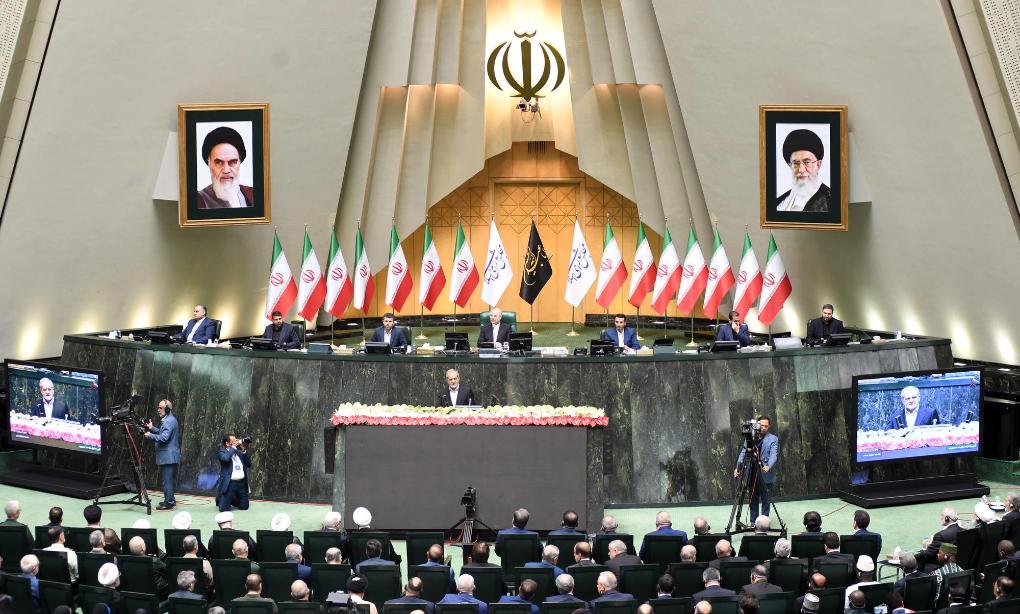 7月30日,佩泽希齐扬(中)在伊朗德黑兰的伊朗议会宣誓就任伊朗总统后发表就职演说。新华社记者沙达提摄