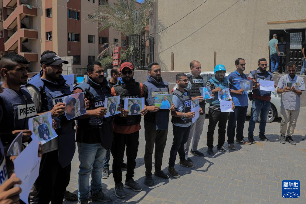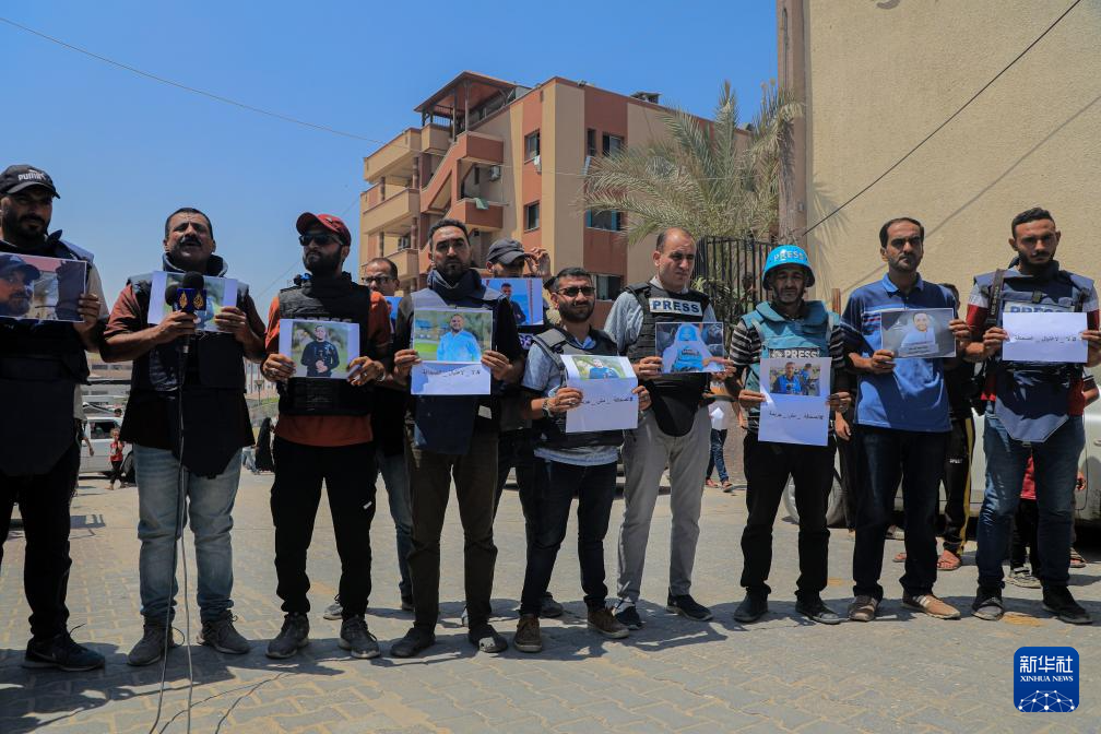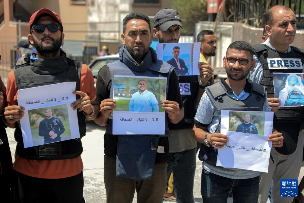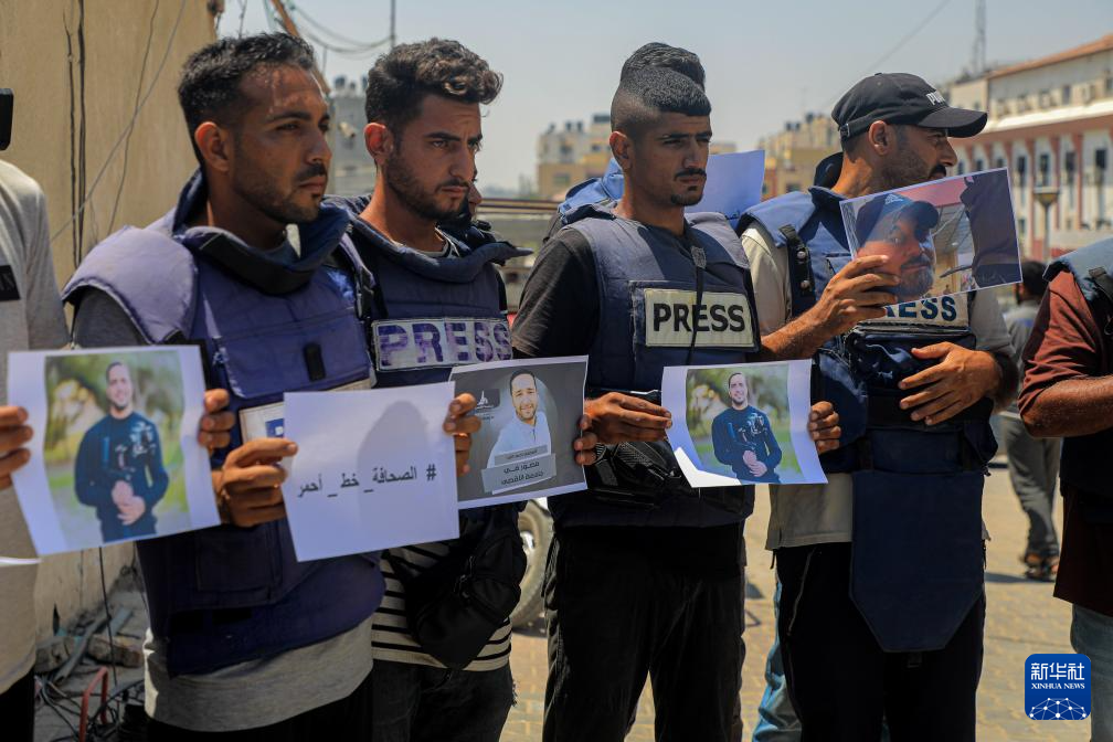 8月7日,在加沙地带南部城市汗尤尼斯的纳赛尔医院前,巴勒斯坦记者抗议以色列军队针对新闻工作者的袭击。