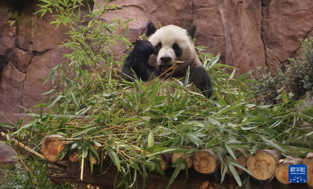 8月8日,大熊猫“云川”在美国加利福尼亚州圣迭戈动物园“熊猫岭”吃竹子。