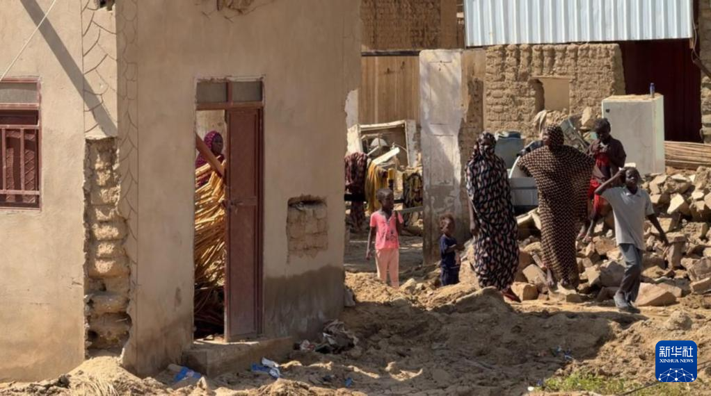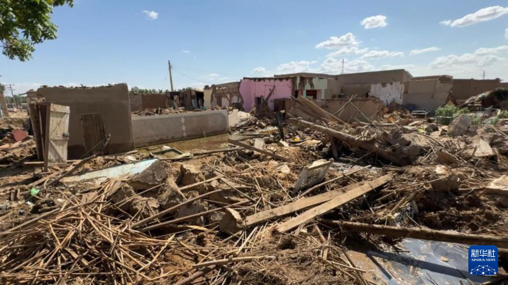 8月10日,在苏丹北部尼罗河州阿布哈马德市,人们检查洪水过后房屋受损情况。