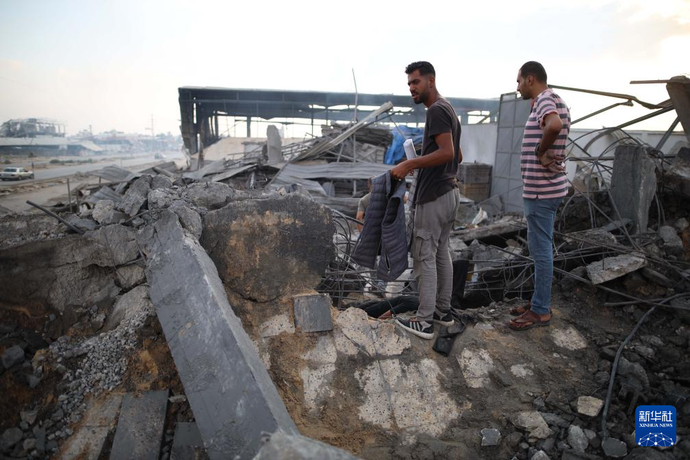 8月17日,在加沙地带中部扎韦达地区,人们查看遭以军轰炸后的建筑废墟。