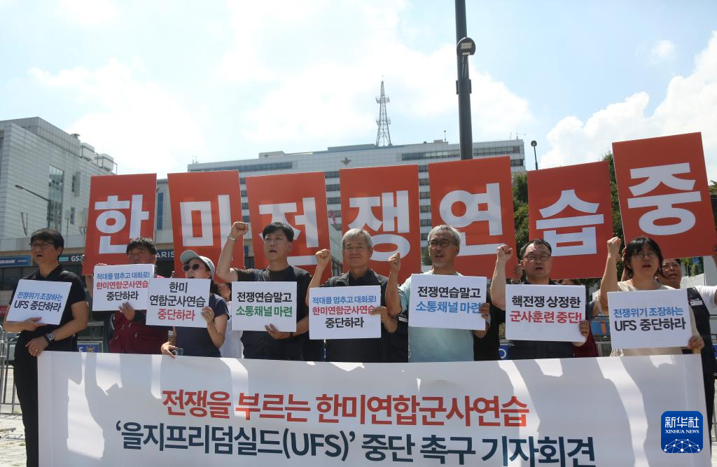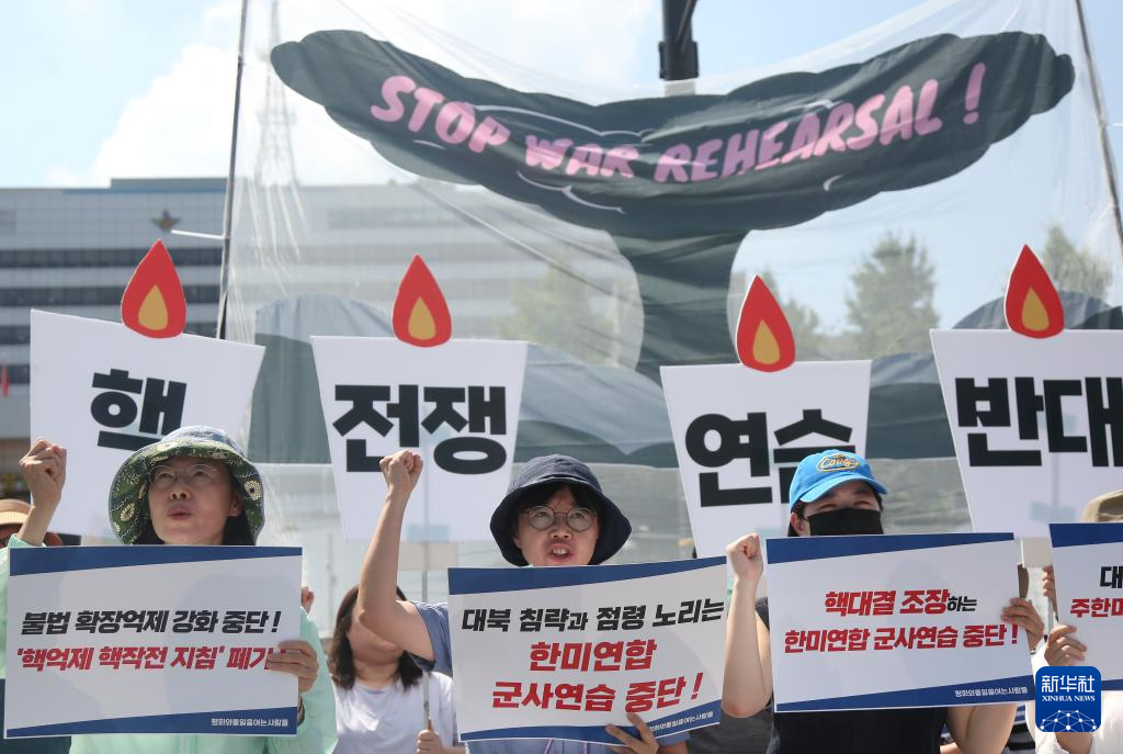 19日上午,“和平统一开创者”“朝鲜半岛和平行动”等韩国民间团体在首尔龙山总统府前举行抗议集会,要求立即停止韩美军队当天启动的联合军事演习。