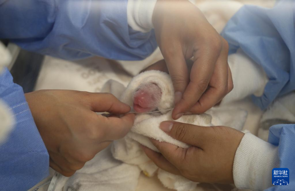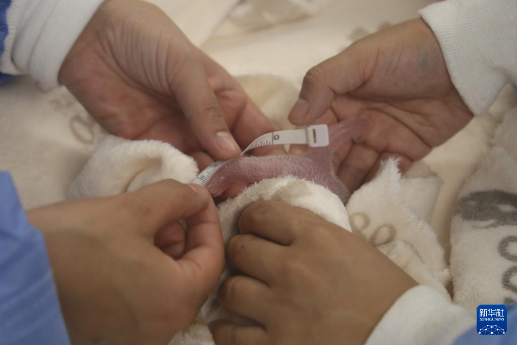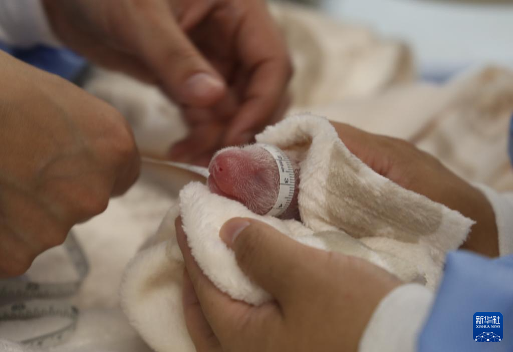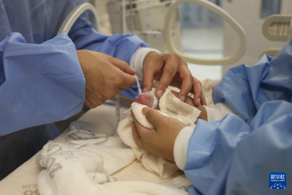 8月22日,在德国首都柏林,工作人员为旅德大熊猫“梦梦”产下的幼崽测量体围。新华社发(柏林动物园供图)