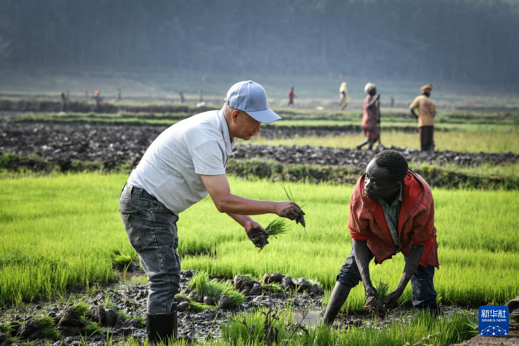 8月14日,在卢旺达南方省胡耶区,水稻专家郑瑞金(左)在稻田里指导当地稻农进行秧苗移栽。