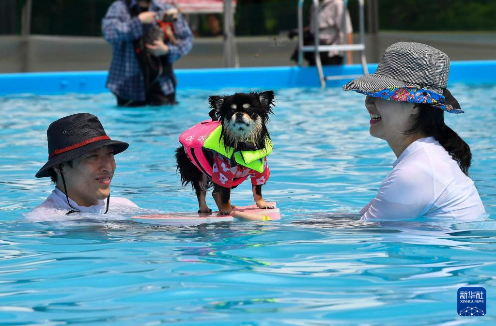 当日,韩国首尔一处泳池对宠物狗开放,宠物狗和主人们在泳池中戏水消暑。